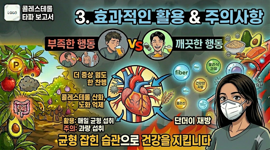 핵심 성분: ① 수용성 식이섬유 – 담즙산 결합 콜레스테롤 배출 ② 식물성 단백질 – 동물성 단백질 대체로 LDL 감소 효과 ③ 이소플라빈 (대두) – 혈관 기능 개선 ④ 식물성 스테롤 – 콜레스테롤 흡수 경쟁