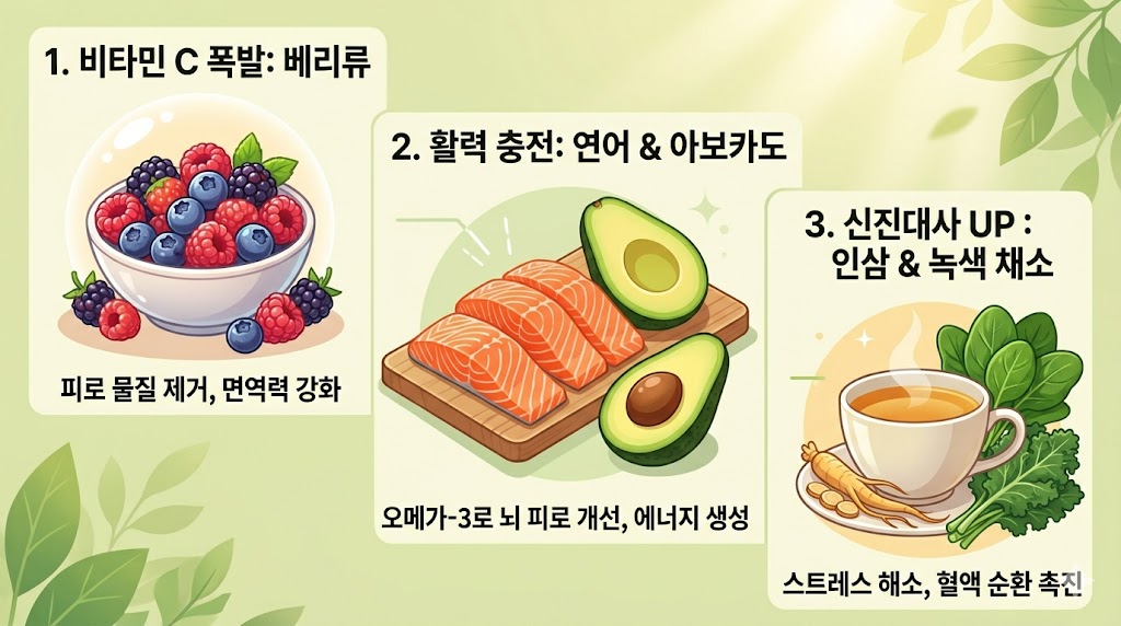 기력 회복 음식이 궁금하신가요? 체력 저하·무기력·만성 피로별 기력을 빠르게 채우는 음식과 영양소, 올바른 섭취법을 완전 정리했습니다.