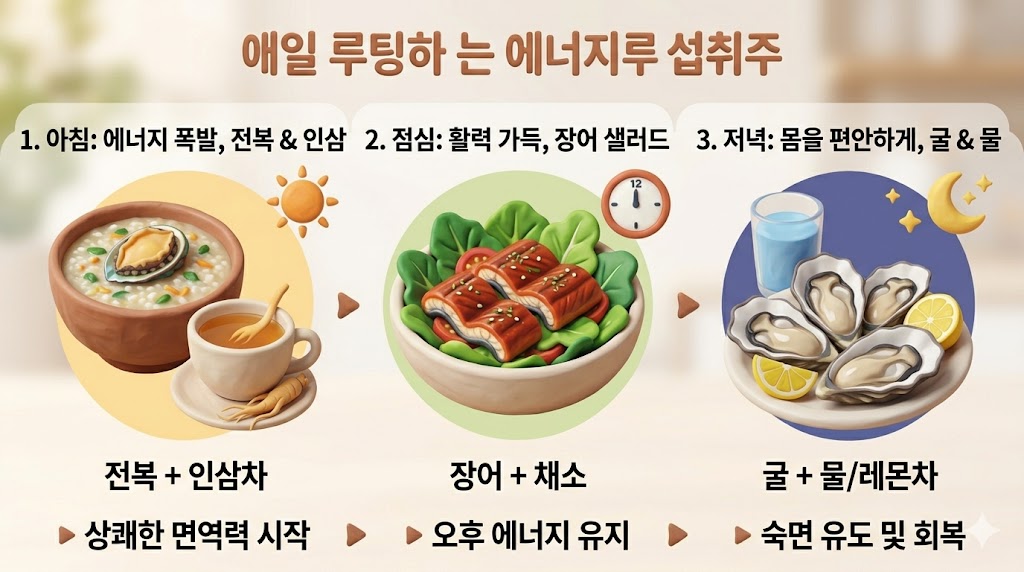 섭취 방법: 매일 아침 달걀 2~3개를 반숙·스크램블·달걀찜으로 먹으면 체력의 기반이 되는 단백질을 공급합니다. 노른자를 버리지 않는 것이 중요합니다. 노른자에 콜린·비타민D·건강한 지방이 집중되어 있습니다.