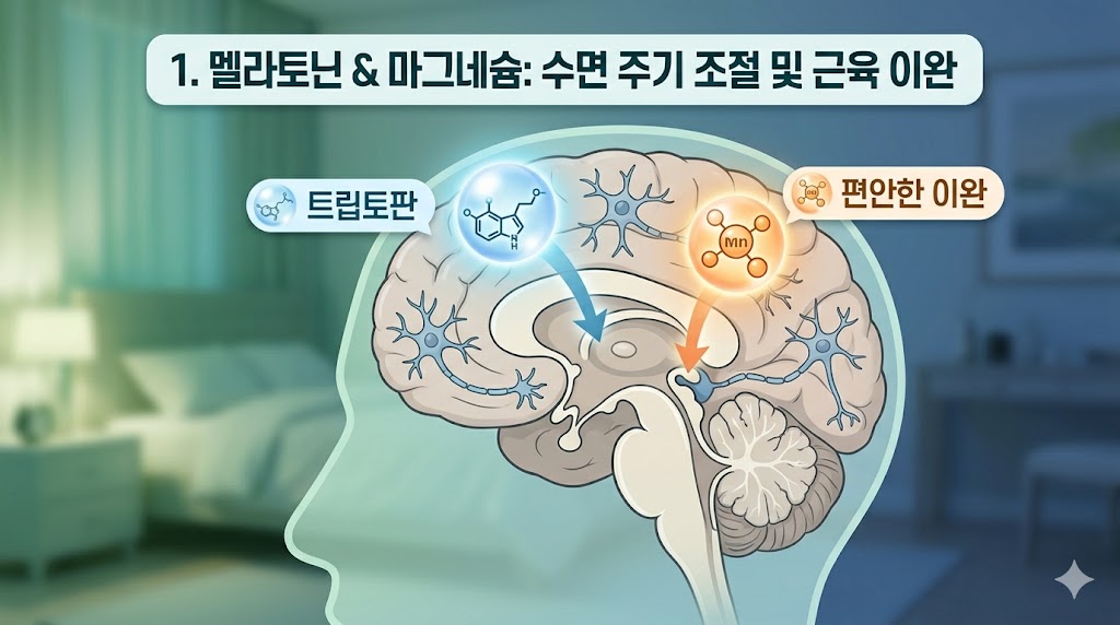 수면 개선 기전: ① 트립토판 → 세로토닌·멜라토닌 합성 원료 ② 비타민B6 → 트립토판을 세로토닌으로 전환하는 효소의 보조 인자 → 전환 효율 향상 ③ 마그네슘 → GABA 활성화·NMDA 수용체 억제 → 신경 이완·수면 유도 ④ 칼륨 → 근육 이완 → 수면 중 근육 경련 방지 ⑤ 세로토닌 → 기분 안정 → 입면 용이