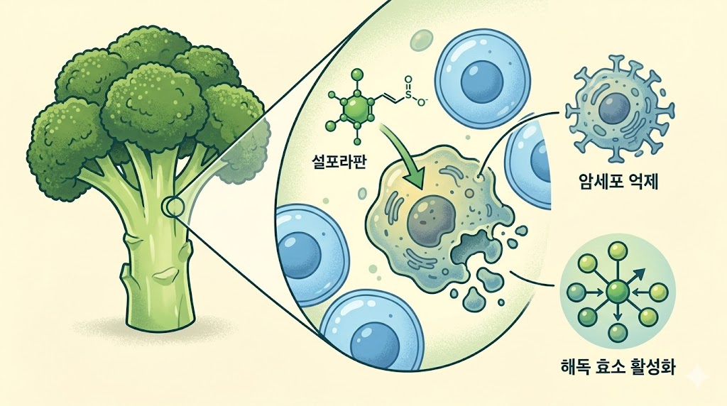 암의 시작 단계 억제: ① 발암 물질 해독 효소(GST·NQO1·글루코로닐 트랜스퍼라제) 활성화 → 발암 물질을 무독화해 DNA 손상 방지 ② DNA 수복 효소 활성화 → 산화 스트레스 유발 DNA 손상 복구 ③ Nrf2 활성화 → 포괄적인 세포 보호 시스템 가동