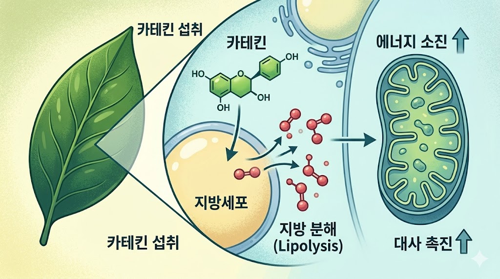 ② 카페인과의 시너지: 카페인이 아데노신 수용체를 차단하고 cAMP를 높여 PKA를 활성화합니다. PKA가 HSL을 인산화·활성화해 지방 분해를 촉진합니다. EGCG + 카페인의 조합이 각각 단독보다 지방 분해 효과가 훨씬 강합니다.