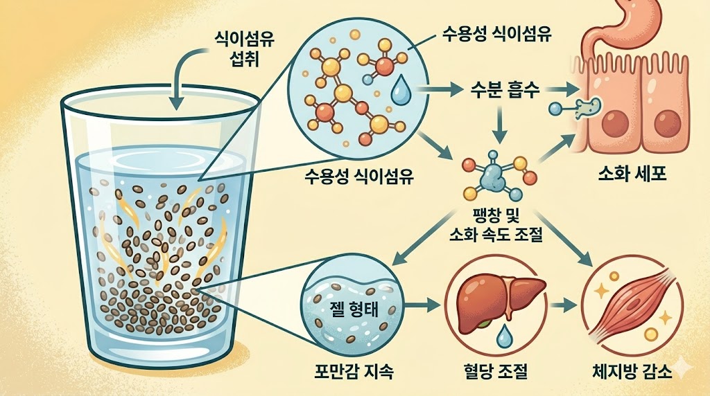 치아씨드가 포만감 유지에 도움이 되는 핵심 이유는 뮤실라지(수용성 식이섬유)가 자기 무게의 10~12배 물을 흡수해 젤로 팽창하며 위를 물리적으로 채우고 위 배출을 늦추어 GLP-1·PYY 같은 포만 호르몬을 자극하고 그렐린을 억제해 4~6시간 포만감이 유지되기 때문입니다. 단백질·건강한 지방이 포만 호르몬을 추가로 자극하고 혈당 안정으로 혈당 저하성 공복감을 방지하는 삼중 포만감 시스템이 치아씨드를 다이어트 보조 식품으로 독보적으로 만듭니다. 하루 1~2큰술을 미리 물에 불려 요거트·오트밀·스무디에 추가하고 충분한 수분을 함께 섭취하는 것이 포만감과 건강 효과를 극대화하는 가장 효과적인 방법입니다.