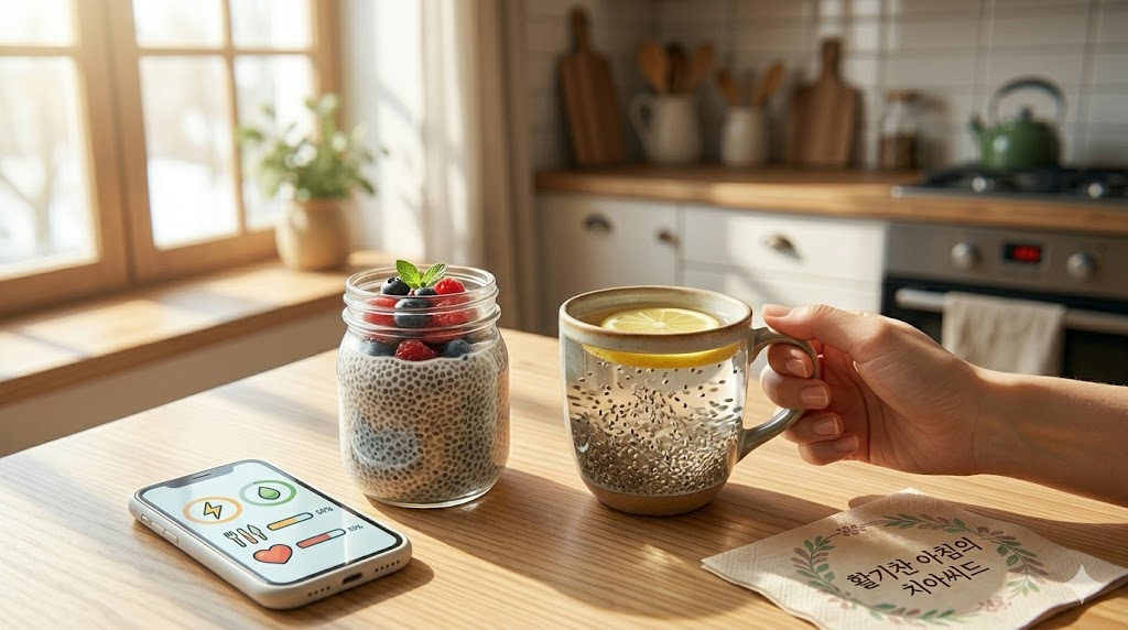 ① 충분한 수분 필수: 치아씨드가 장에서 수분을 흡수해 팽창합니다. 수분이 부족하면 오히려 변비가 악화됩니다. 치아씨드 섭취 시 하루 수분 섭취를 충분히 늘립니다.
