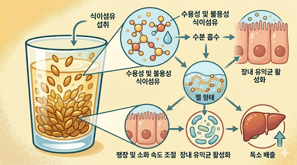 ① 점성 다당류의 장 코팅: 아마씨의 점성 다당류(뮤실라지)가 물을 흡수해 두꺼운 젤을 형성합니다. 이 젤이 장 점막을 코팅해 자극으로부터 보호하고 점막 세포 재생을 지원합니다.