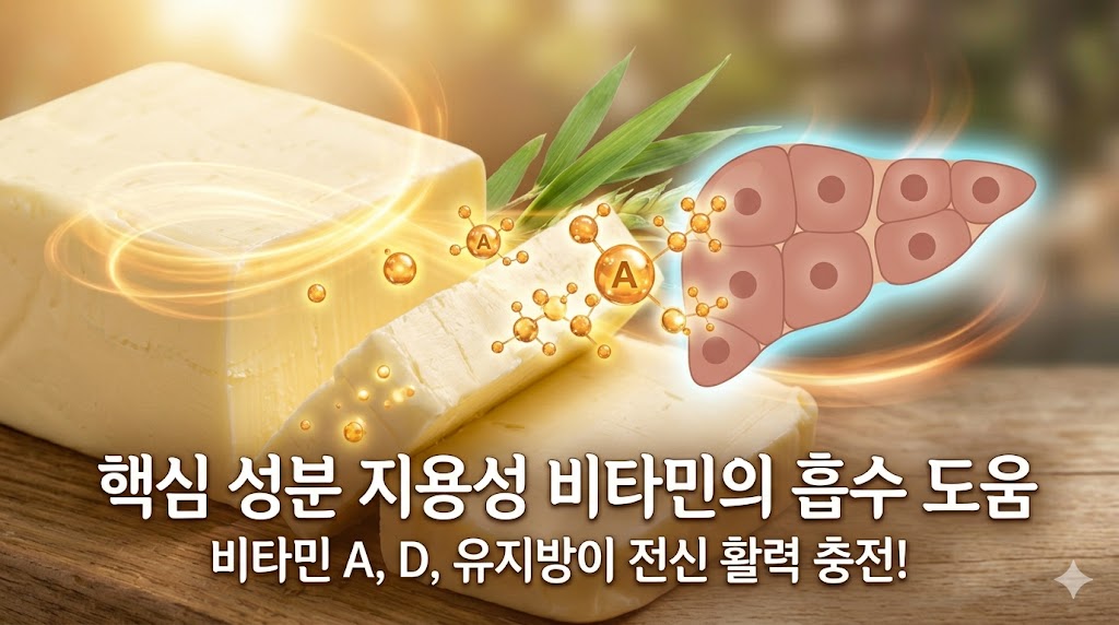 효과: 버터의 지방이 지용성 비타민(A·D·E·K)과 카로티노이드의 흡수율을 3~5배 높이는 효과가 임상에서 확인되었습니다.