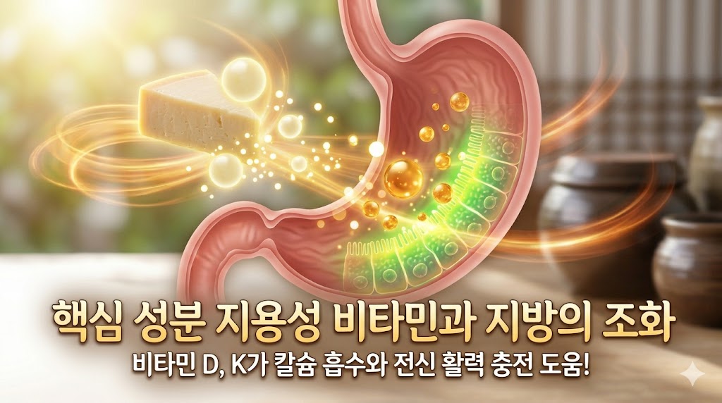 ③ 유지방의 흡수 보조: 치즈의 지방이 담즙산 분비를 자극해 지용성 비타민D 흡수를 높이고 비타민D가 칼슘 흡수의 핵심 조절자로 작용합니다.