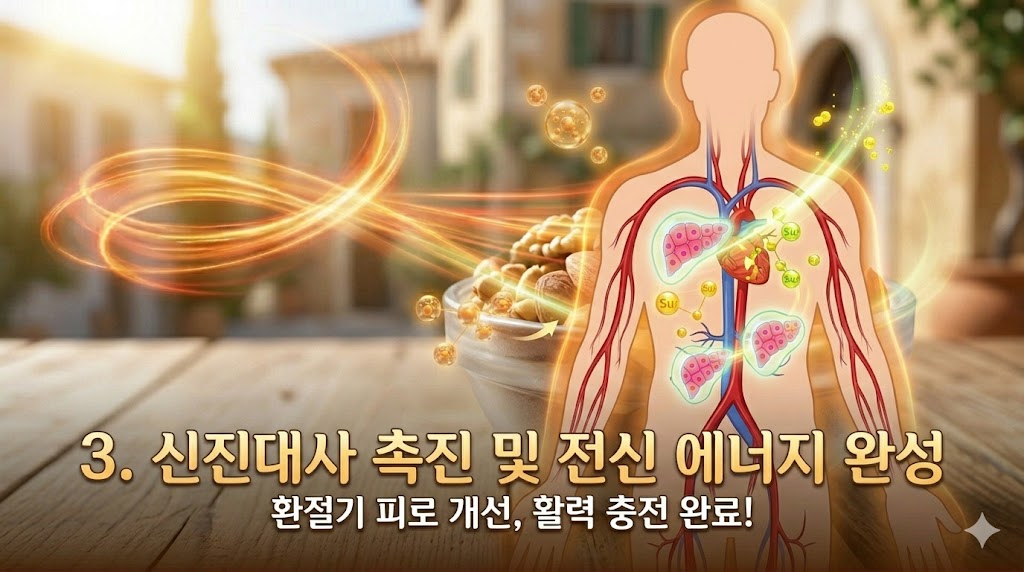② 뇌 활성화: ① 오메가3(ALA)·단일 불포화지방산 → 뇌 세포막 유동성 향상 ② 트립토판 → 아침 세로토닌 합성 → 기분·집중력 향상 ③ 마그네슘 → 신경 전달 최적화
