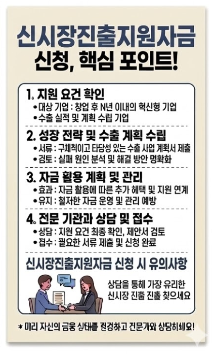 신시장진출지원자금을 신청하려면 중소기업기본법상 중소기업에 해당해야 해요. 사업자등록이 되어 있고 실제로 사업을 운영 중이어야 하며, 신시장 진출 계획이 구체적이어야 해요.